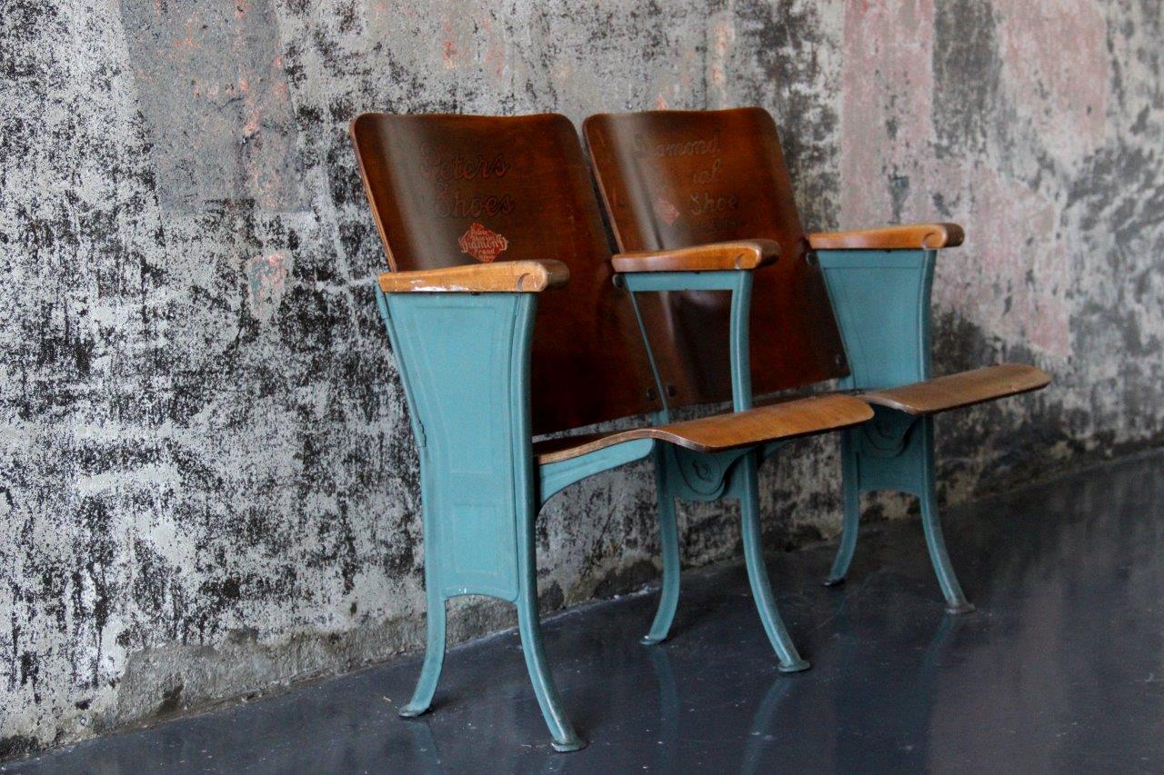 Auf dem eigentlich kurzen Weg und dann doch noch so langen Flur gibt es jede Menge zu entdecken: Wie die alten Klappstühle aus dem Kino, die sich mit ihrem türkisen Anstrich so ausnehmend gut vor der rauen Betonwand machen. Gegenüber Stars und Sternchen der Vergangenheit als Foto-Collage an die Wand geklebt.