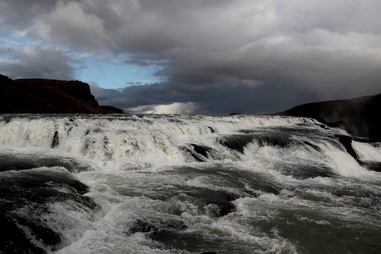 Gullfoss, der goldene Wasserfall, sei einer der schönsten Wasserfälle Islands, heißt es. Er ist unsere letzte Station an diesem Tag und zweifelsohne beeindruckend. Weniger golden, eher bedrohlich grau, stürzen die Wassermassen des Flusses Hvitá hier in eine enge Schlucht. 32 Meter tief und über mehrere Kaskaden. Fast immer sind die brausenden Nebelschwaden von einem Regenbogen überspannt. Wir sehen uns das urgewaltige Schauspiel von verschiedenen Terrassen aus an. Kommen ganz nah heran, spüren das eiskalte Wasser im Gesicht. Das Gefühl ist überwältigend. Wir genießen die donnernde Geräuschkulisse und die aufgewühlten Wassermassen. Und fühlen uns klein. Irgendwann ist das Wetter gnädig: Die Wolkendecke öffnete sich, wenn auch nur einen Spalt breit, und gönnt uns den Anblick zweier Regenbogen über Gullfoss. Der macht seinem Namen nun tatsächlich Ehre.