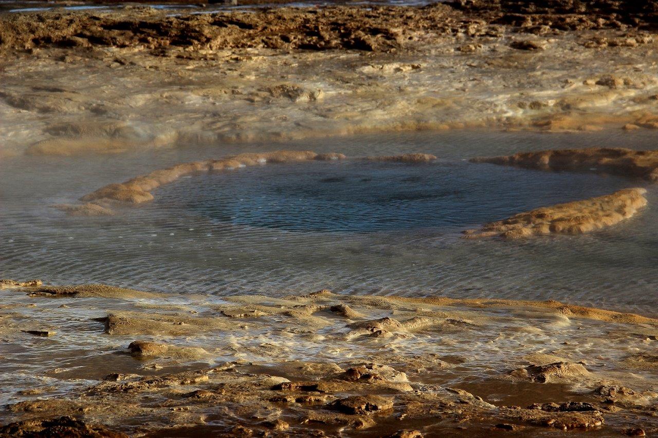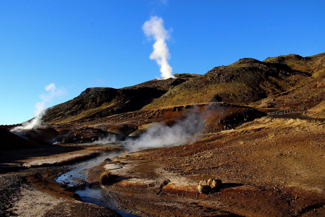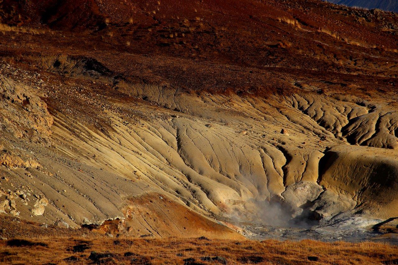 Wir klettern den Hang hinauf, zur Thermalquelle Blesi. Deren Wasser leuchtet hellblau. Auch hier sind Mineralien im Spiel: ihre Struktur reflektiert einfallendes Licht und zaubert das strahlende Blau. Vor uns breitet sich die Ebene mit ihren dampfenden, zischelnden Erdspalten und dem faszinierendsten Farbspiel aus. Eingebettet in die großartige Kulisse des Vulkans Laugarfjall.