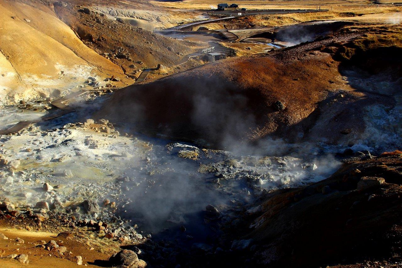 Wenige Kilometer später erreichen wir Seltún, eines der vielen Hochtemperaturgebiete Islands. Hier bilden Vulkangasspalten, so genannte Solfatare, heiße Quellen und Blasen werfende Schlammtöpfe eine farbintensive Kraterlandschaft mit Schattierungen von Ocker, Orange und Rot bis Grün. Es brodelt, zischt und dampft. Es stinkt nach Schwefel. Schilder warnen eindringlich vor den Launen der Natur, den schwefelhaltigen Dämpfen, 200° heißem Schlamm und möglichen Gasexplosionen. Bereits im frühen 18. Jahrhundert baute man in Seltún Schwefel ab. Ab den 1970er Jahren wurde das Gebiet für die Energiegewinnung erschlossen. Aus Bohrlöchern wurden künstliche Geysire. Als eines davon im Jahr 1999 explodierte und heiße Lehmfetzen bis zu zwei Kilometer hoch schleuderte, wurde das Vorhaben eingestellt.