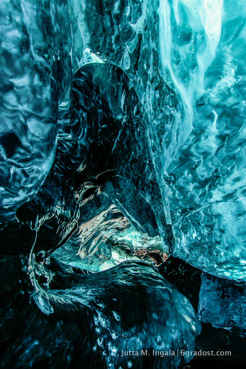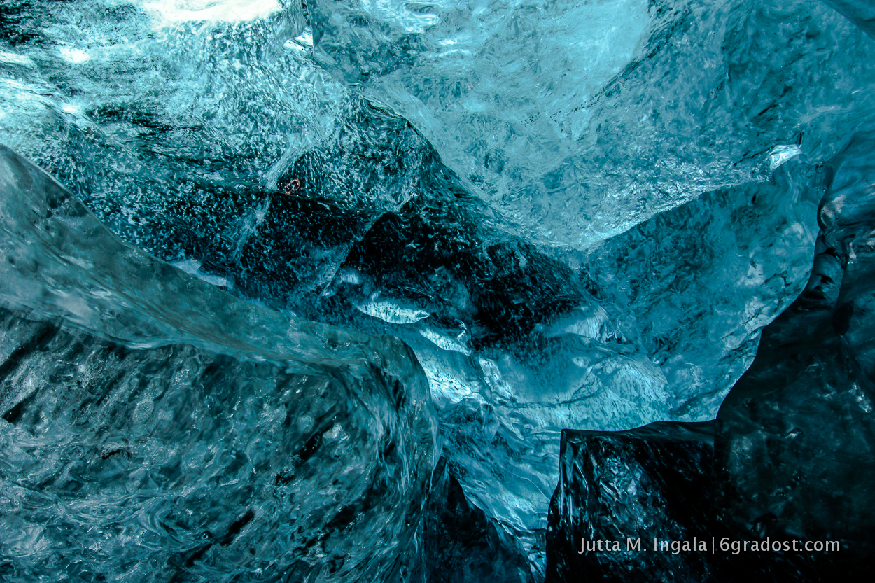 Je tiefer wir in die Höhle vordringen, desto intensiver wird das Blau. Das Eis ist praktisch frei von Luftblasen und reflektiert den blauen Anteil des Lichts. Seine Oberfläche fühlt sich gut an. Ein Handschmeichler in großzügigen Wellen. Klar wie Glas, nur hin und wieder von feinen Linien durchzogen. 20, 30 Meter dick. Wie viele Tonnen Eis mögen da über mir sein? Ich bin fasziniert. Und ehrfürchtig zugleich. Eine Eiswelt wie aus den Nordischen Göttersagen. Und auch die Fotos zeigen nun, was ich sehe.