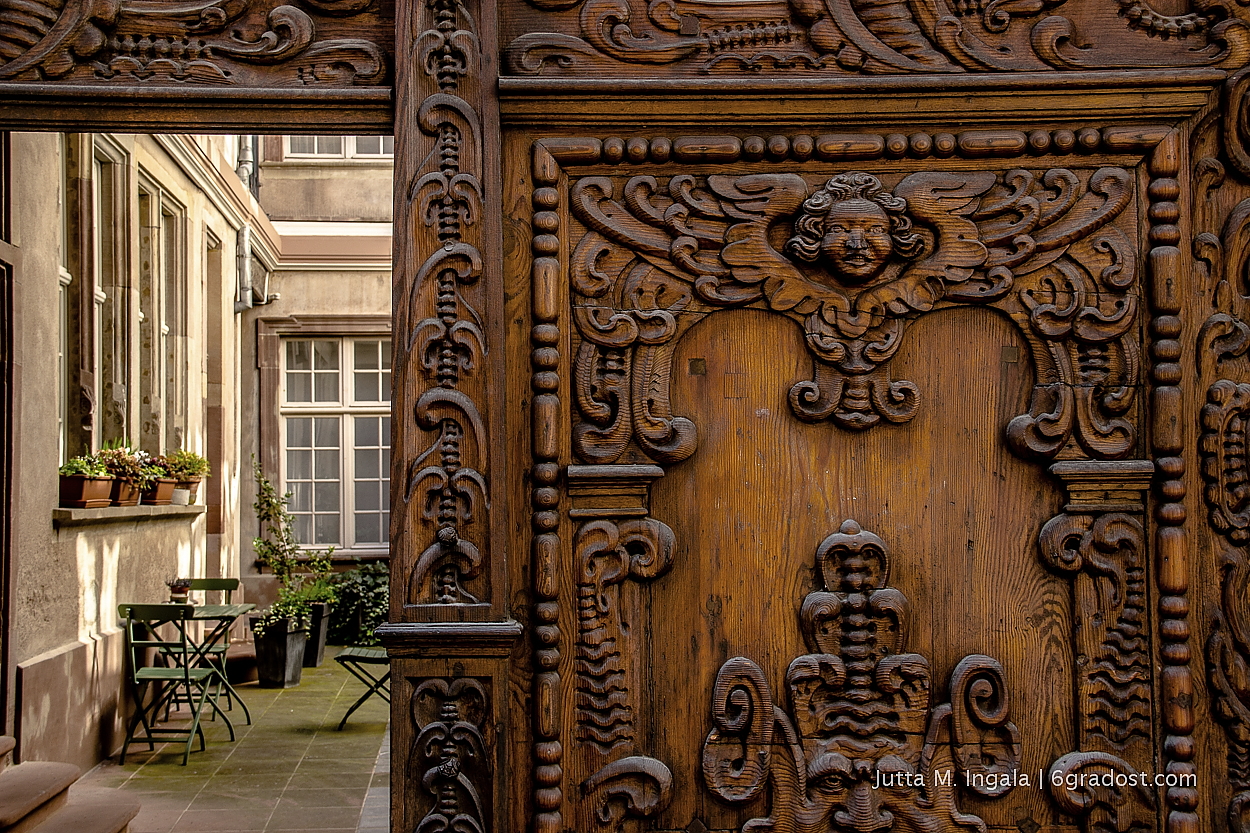 Hätte ich nicht schon längst ein Faible für bunte Häuserfassaden, für Türen und Fenster, spätestens jetzt hätte ich mich unsterblich verliebt. Bunt heißt in Straßburg pastellfarben: bleu, rosa und hellgelb. Vereinzelt leuchtet es erdbeerrot oder pistaziengrün. Kunstvoll geschnitzte, schwere Holzportale wehren neugierige Blicke ab, einige jedoch stehen einladend offen. Fenster mit hübschen Läden – manche hängen schief in den Angeln – wirken wie die Augen der Stadt. Überhaupt ist hier fast nichts gerade, aber eben darum so reizvoll.Portal in der Rue de l'Epine