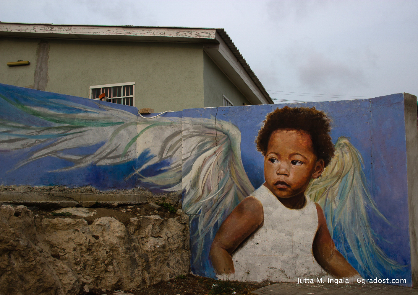 Eher zufällig entdecke ich in den nächsten Tagen weitere Murals von Garrick Marchena in und um Willemstad: Den „Mariepampoen Angel“, einen kleinen, hübschen Engel, den der Künstler seiner alten Nachbarschaft im Stadtviertel Punda gewidmet hat. Oder „Heart Overflowing“, meinem Lieblings-Mural, ein Werk, das Marchena zusammen mit der lokalen Künstlerin Valerie Parisius realisiert hat und das eine Wand jenseits der Sint Annabaai im Welterbe-Viertel Otrobanda ziert.