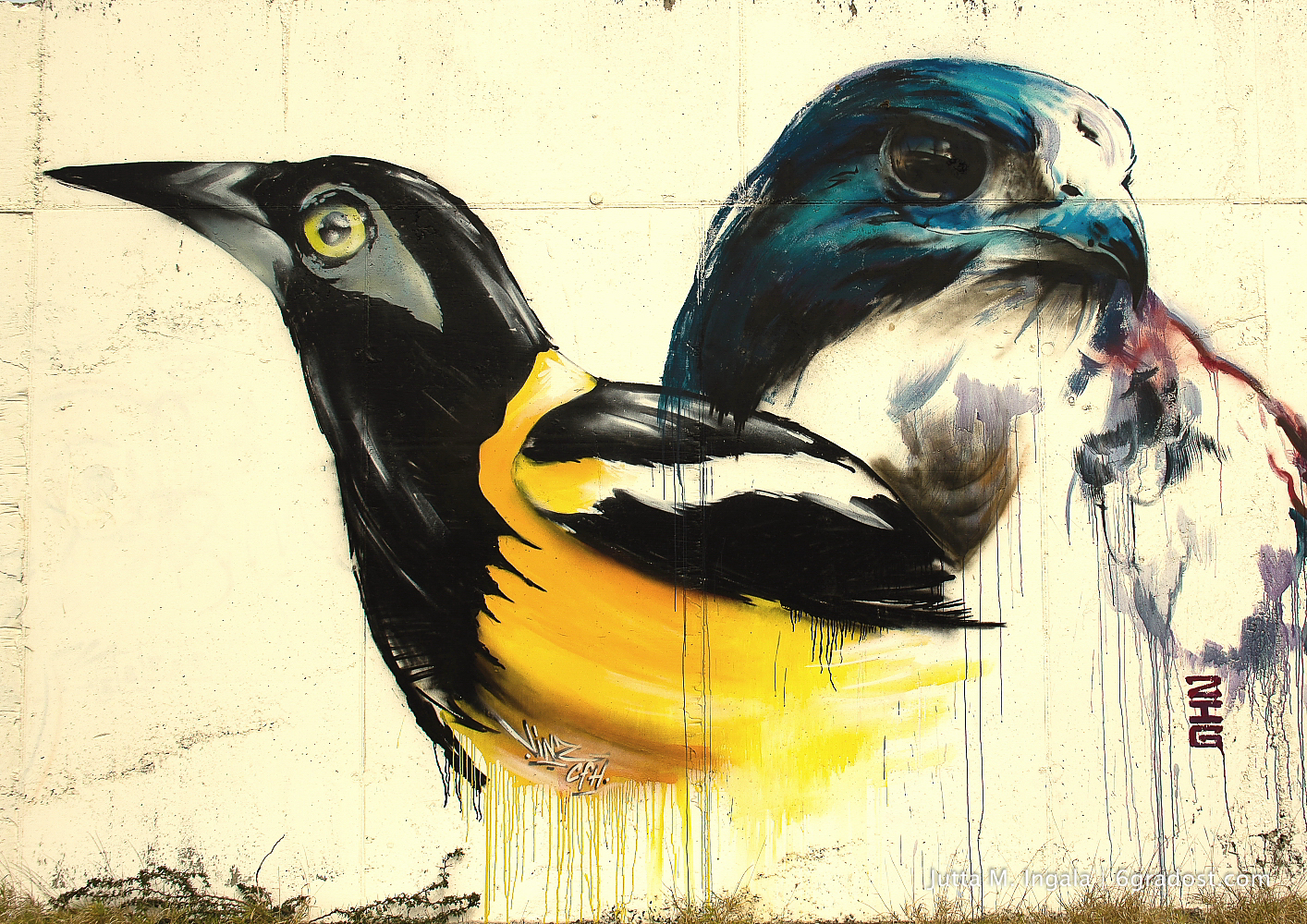 Ein ganz anderes Sujet zeigt “De dief en de jager” – “Der Dieb und der Jäger”. Ebenfalls ein Gemeinschaftsprojekt, diesmal zwischen Marchena und Daniel Leisner, das ich am Standrand von Willemstad entdecke. Der „Dieb“ ist der Trupiaal, ein heimischer Vogel, der für seinen wunderschönen Gesang bekannt und für seine diebische Ader berüchtigt ist. Der „Jäger“ ist der größte Raubvogel auf Curaçao, ein Falke oder Partawela, den man jedoch nur selten zu Gesicht bekommt.