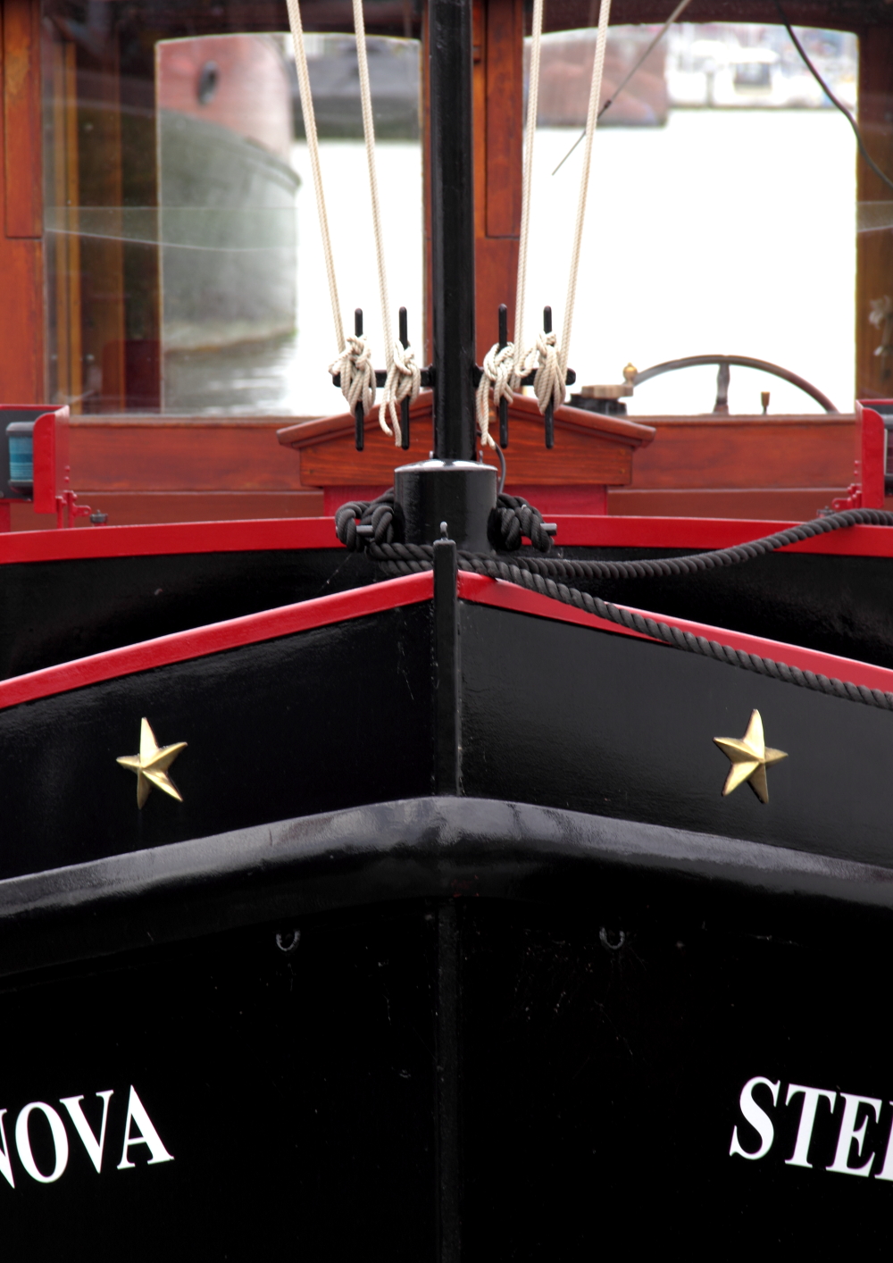 Ein pechschwarz gestrichenes Boot in zweiter Reihe hebt sich von den anderen ab. Glänzend vom Regen, mit roten Akzenten und einer einladenden Bank an Deck. Am Bug prangen ein goldener Stern und der Schriftzug „Stella Nova“ – „Neuer Stern“. Kein Segler, viel kompakter, kräftiger: ein Arbeiter.