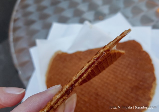 Wir schlendern weiter, vorbei an den Marktständen, deren Angebot von gerippter Unterwäsche über nietenbewerte Gürtel bis hin zu Pudelmützen reicht. Dazwischen die „Fressbüdchen“. Marktgänge machen schließlich hungrig. Es gibt Poffertjes und Patat, buntes Gemüse und noch buntere Fische. Und dann prangt dort in großen Lettern „Original Stroopwafels“. Doch auch ohne die auffällige Werbung hätte für mich kein Weg am Stand vorbeigeführt: Die Luft ist schwer von süßem Duft!