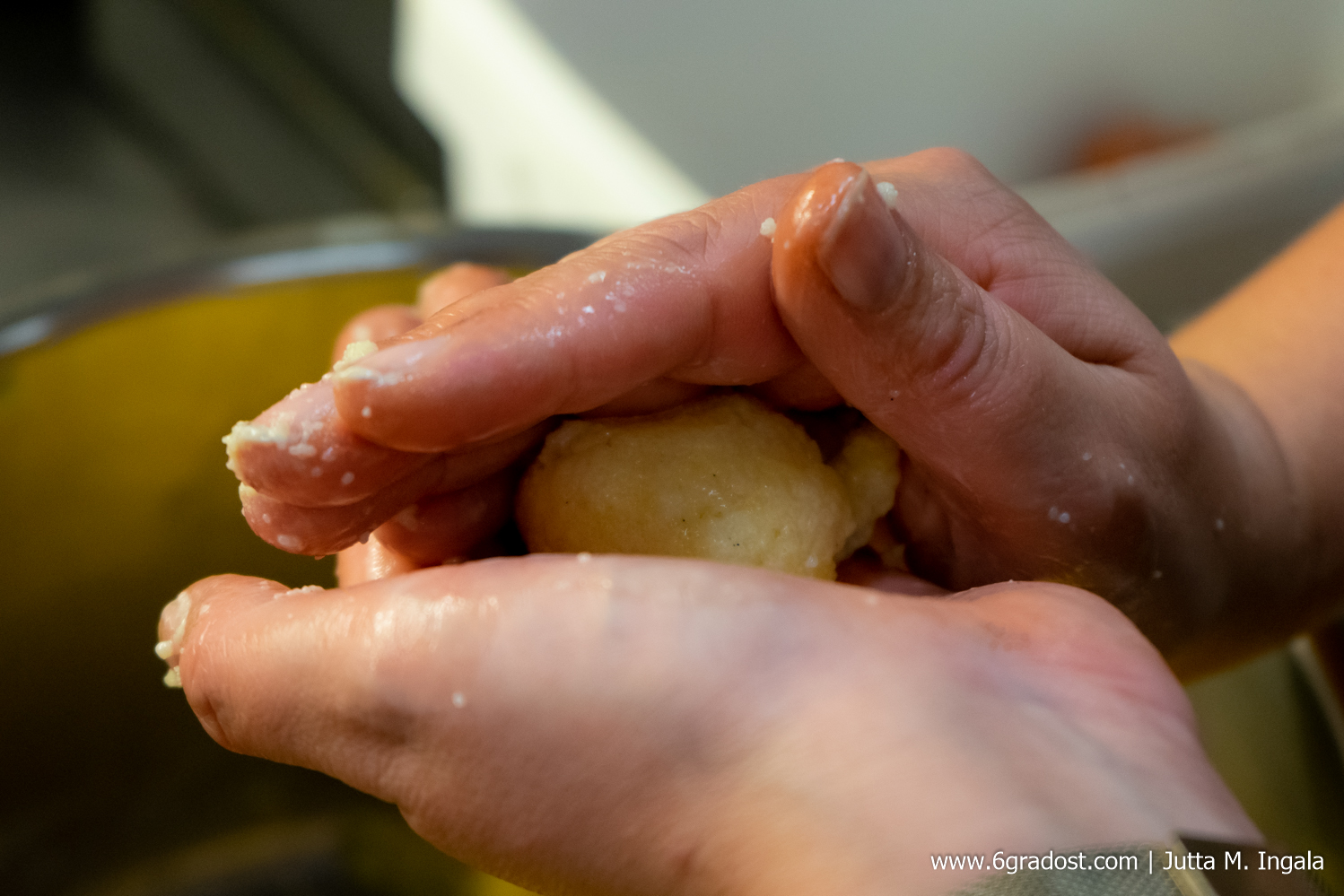 Es soll ja Menschen geben, die sich nichts aus süßen Sachen machen. Ich hingegen verzichte lieber auf eine Vorspeise als auf ein feines Dessert. Bei der Küchenparty gebe ich also die Pâtissière und versuche mich zusammen mit Klara an Grießknödeln mit Zwetschgenmus. Ein junger Koch steht uns zur Seite. Welch ein Glück! Denn vor lauter Geplauder und neugierigem Topfgucken – und dann ist natürlich noch die Lemberger-Verkostung in vollem Gange –, vergesse ich beinahe, dass die Arbeit in der Küche eingespielt sein muss. Teamarbeit. Jeder hat seine Aufgaben. Waschen, wiegen, sieben, Butter zerlassen oder aromatisches Mark aus kostbaren Vanilleschoten kratzen gehört zu meinen. Auch die Zwetschgen müssen wir entkernen. Vorsichtig, damit die prallblauen Früchte nicht zerdrückt werden. Die Küche ist in Bewegung. Klara formt perfekte Knödel und am Herd nebenan schabt einer aus dem Team „Spätzle“ ebendiese schwäbischen Teigwaren temperamentvoll ins sprudelnde Salzwasser. Scheinbar mühelos. Ein Könner.