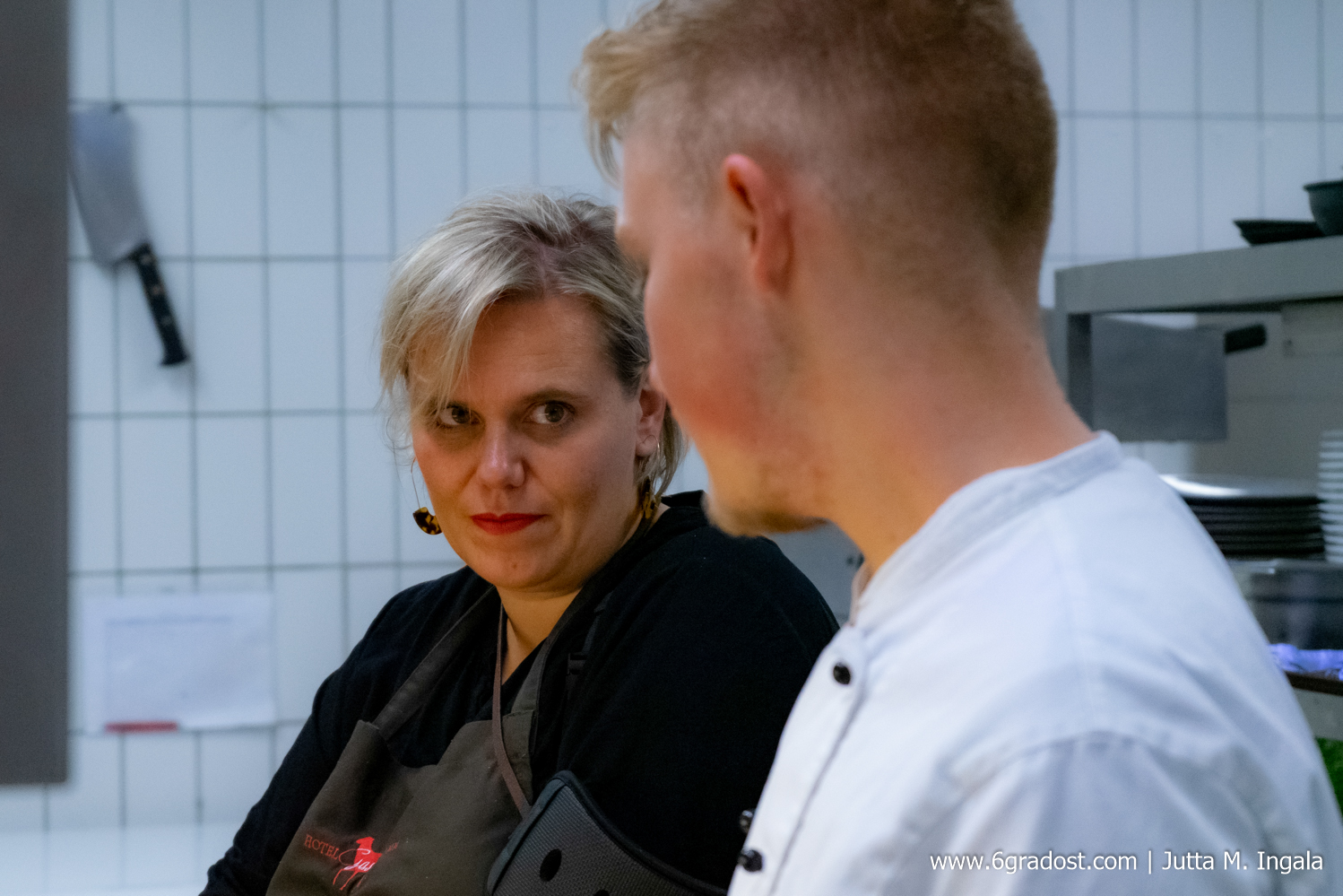 Gastgeberin im Lamm ist Sabine Bramm. Die Frau mit der lebhaft heiteren Ausstrahlung hat uns nicht nur in ihr Haus, sondern auch zur Küchenparty eingeladen. Ein Gefühl für die Region und die Menschen sollen wir bekommen. Über den Gaumen geht das ganz hervorragend. Schwäbische Spezialitäten verheißt das Menü. Kreativ interpretiert, daran lässt Sabine Bramm keinen Zweifel. Sie ist ein Genussmensch, lässt zum Auftakt des besonderen Abends Appetithäppchen reichen, denen Mus aus selbst geernteten Quitten einen fruchtigen Tupfer aufsetzt, und erzählt vom Lamm. Dabei schwenkt sie einen Lemberger, der in der Steillage der nahen Rosswager Halde angebaut wird, erfreut sich merklich an dessen schönem Bouquet. Wir tun es ihr gleich, schlendern dann gemeinsam hinüber in die Küche und tauschen alsbald Lemberger gegen Kochschürze und lustige Täfelchen, die uns wie Orden an der Brust heften. „Zwetschge“ steht auf meinem. In fotogenen Kreidelettern. Schließlich mag auch das Auge etwas zum Festhalten haben.