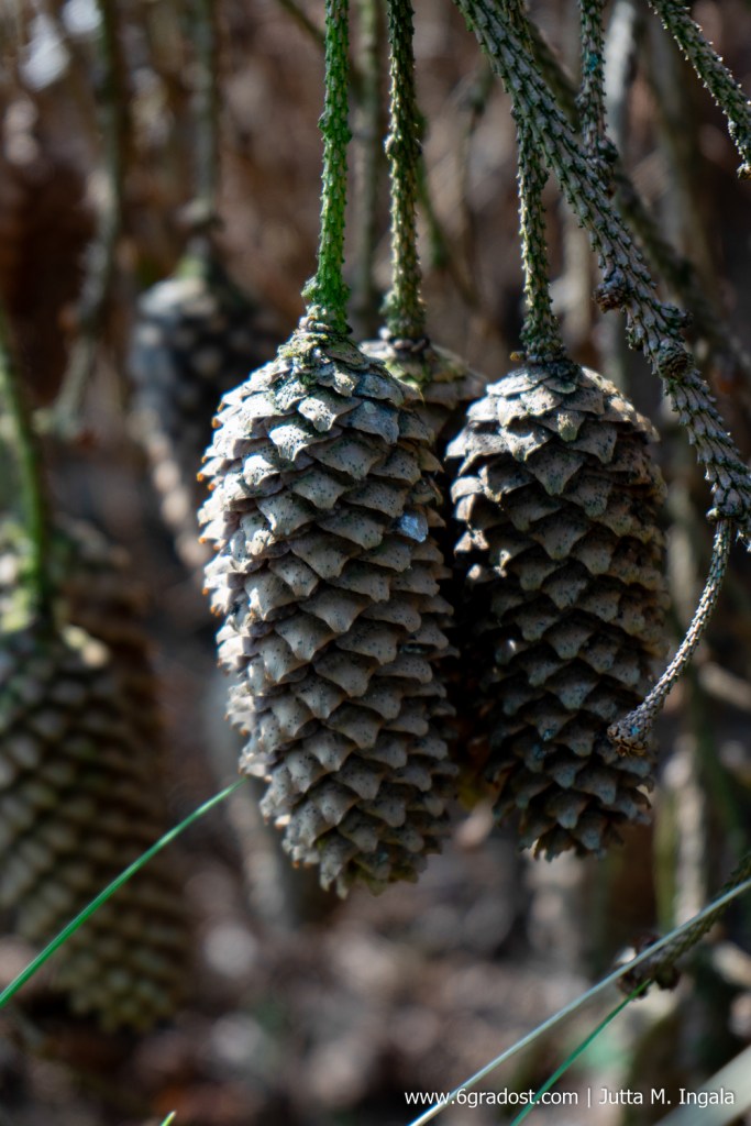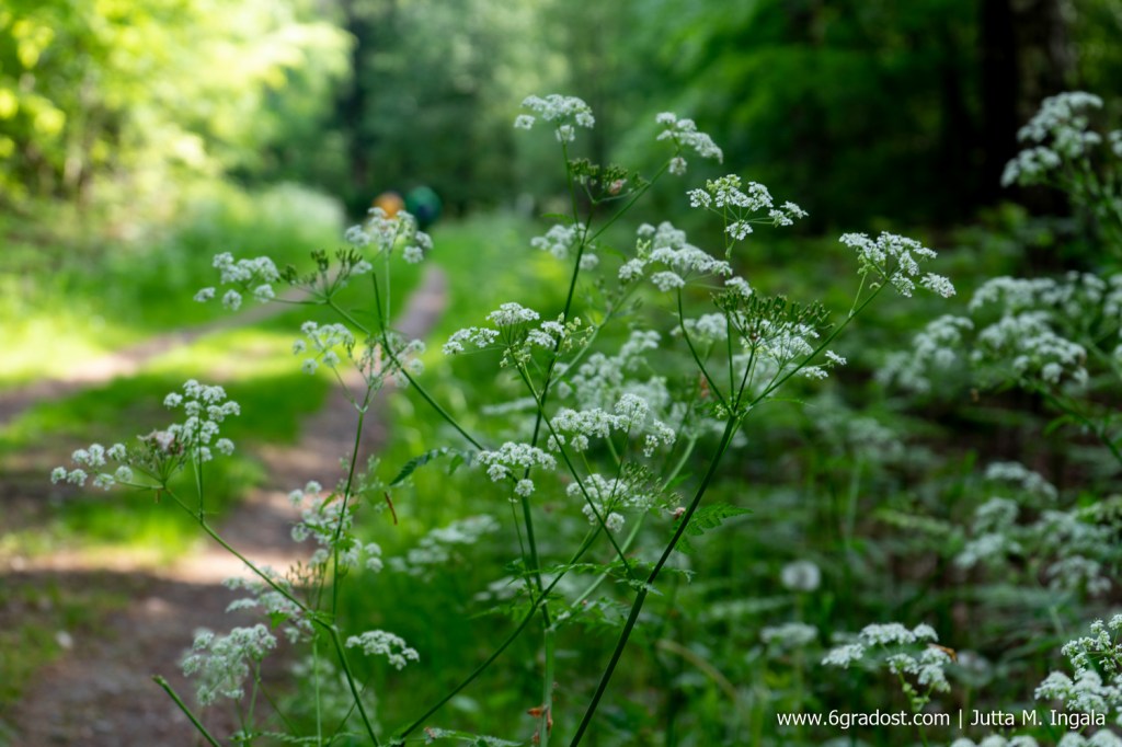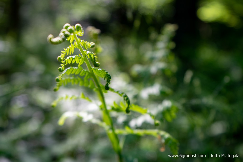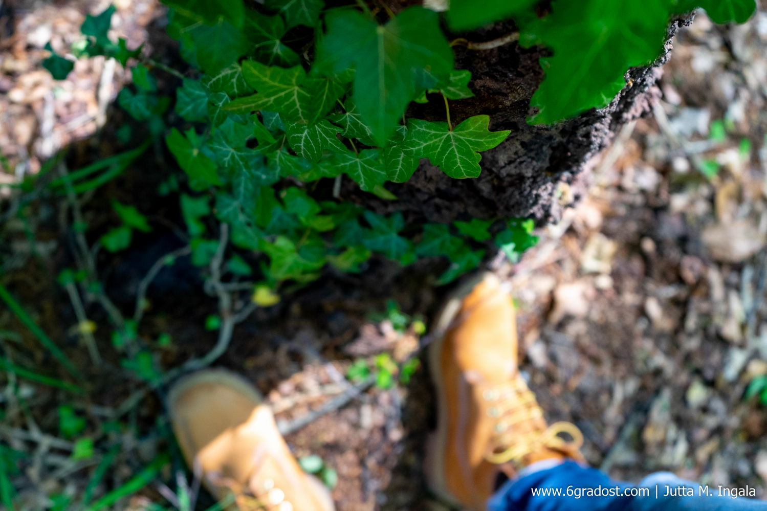 Wieder eingetaucht in den Wald, gilt es den Blick öfter einmal auf den Boden zu lenken. Über den schmaler werdenden Pfad, der sich jetzt in schönem Auf und Ab windet, kriechen knorrige Baumwurzeln. Die Vegetation wird dichter. Riesenhafter Adlerfarn erzählt davon, dass der Wald an dieser Stelle sehr alt sein muss. Wilde Brombeeren haschen mit ihren langen Ranken und zarte Kletten heften sich an unsere Hosen. Wer mit Kindern unterwegs ist, kann hier sehr anschaulich erklären, was sich der Mensch in der Natur abgeschaut hat. Mit einer Lupe in der Tasche werden für kleine Wanderer aus winzigen Widerhaken faszinierende Studienobjekte! Da lässt sich auch gleich der zähe Gundermann, das fast vergessene Küchen- und Heilkraut mit seinen speckig-grünen Blättern und den winzigen lila Blüten, näher in Augenschein nehmen. Und natürlich die Waldheidelbeeren, die im Dämmerwald so üppig wachsen. Doch Obacht: Gucken, Schnuppern und Anfassen ist im Naturschutzgebiet erlaubt, Pflücken leider nicht.