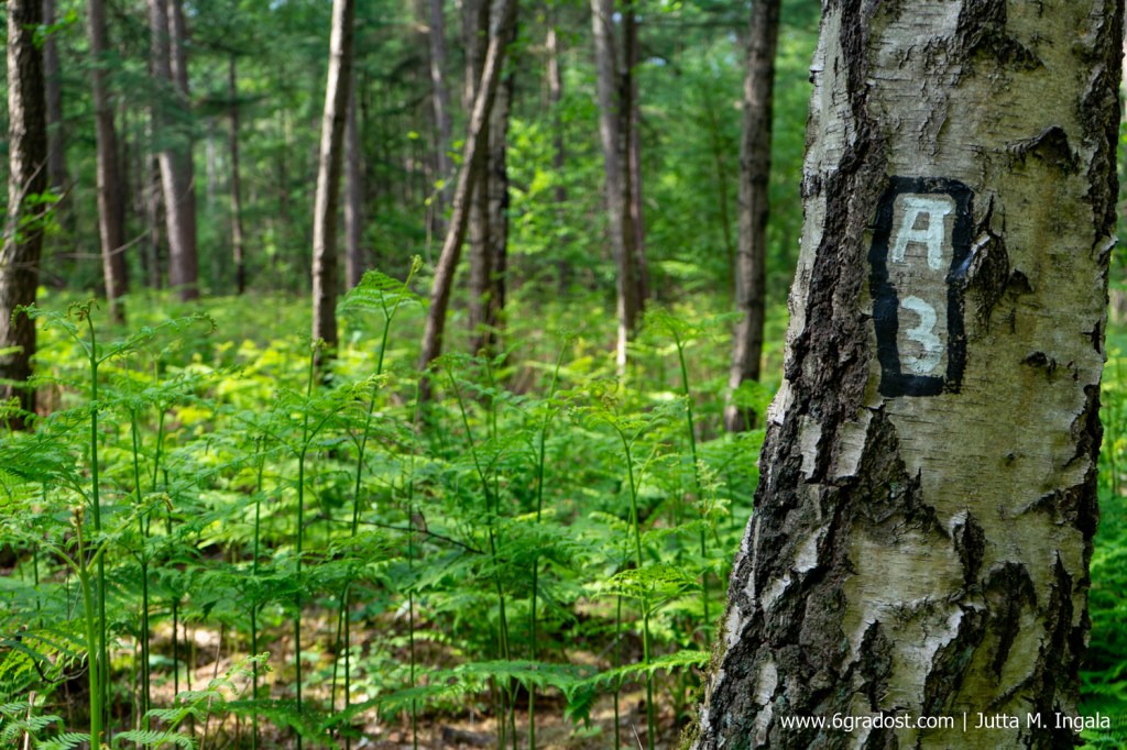 Das Tor zum Dämmerwald – hier der Wegmarkierung A3 folgen – ist eine lichte Allee. Flankiert von dichtem Farn und weiß blühendem Ackerhornkraut, überspannt von einem sonnendurchfluteten Blätterdach. Noch ist die Landschaft leise und hübsch geordnet. Doch schon bald erscheinen ganz neue Protagonisten auf der Bühne. Umgestürzte Bäume, schon seit langer Zeit sich selbst und den unscheinbaren Akteuren des Waldes überlassen: dick mit Moos bewachsen, Risse in der Rinde von winzigen Pilzen erobert, wer ganz nah kommt und Geduld mitbringt, beobachtet wie sich Tausendfüßer ins morsche Holz bohren. Ein Rascheln im Unterholz – Vielleicht eine Blindschleiche oder gar eine Waldeidechse? –, Vogelstimmen, die anschwellen. Die Kulisse verändert sich.