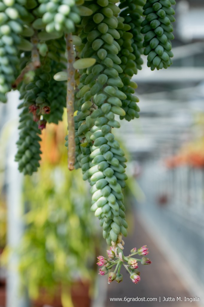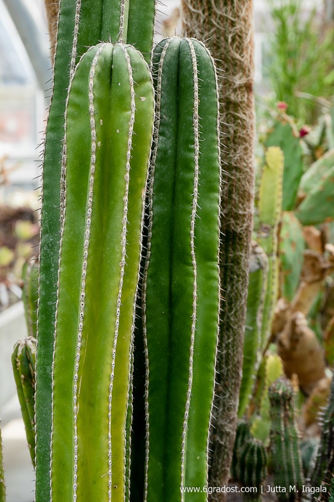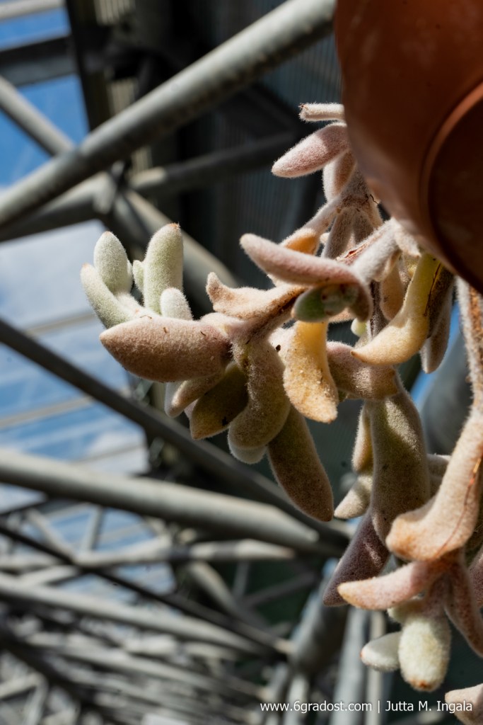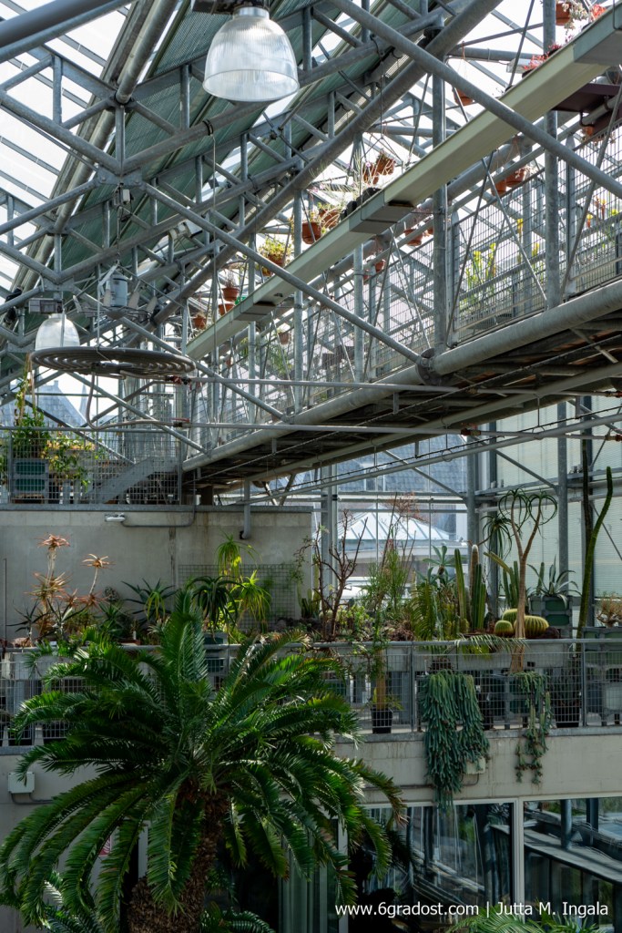 Durch die Gewächshäuser führt ein Labyrinth aus schmalen Stegen über verschiedene Ebenen. Wie Blumenkästen am heimischen Balkon hängen hier Schaukästen an den Geländern. Darin Objekte wie petrifizierter Ginkgo, Kapseln der Araukarie und viel botanisches Wissen. Im wüstenwarmen Klima unter Glas gedeihen bizarre Kakteenarten neben dickfleischigen Sukkulenten. Einige Pflanzen tragen weißen Pelz zur Schau, andere balancieren winzige Tröpfchen – klar wie Tau – auf krankenartigen Rispen und fleischfressende Kannenpflanzen locken Insekten. Pflanzen in Gondeln hängen über den Stegen und den Köpfen der Besucher.