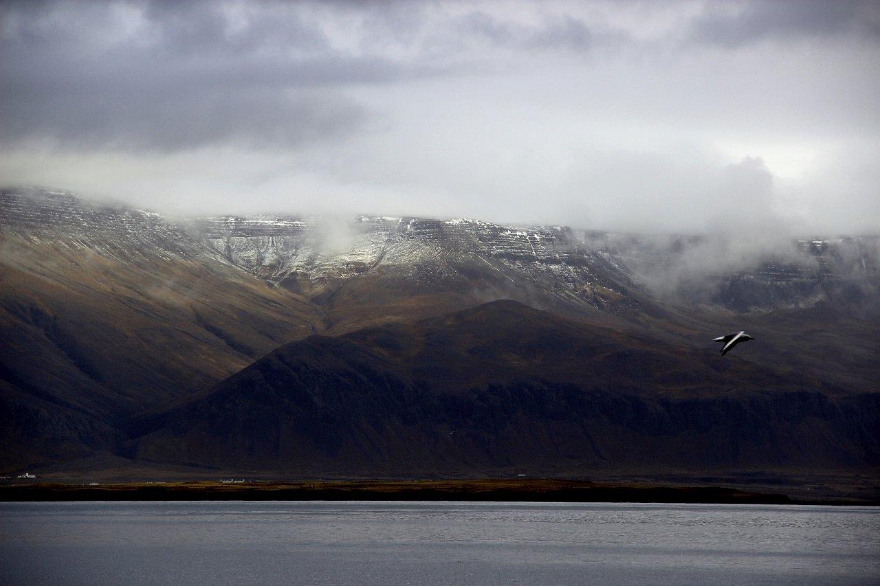 Blick über di Bucht auf Reykjavíks Hausberg Esja